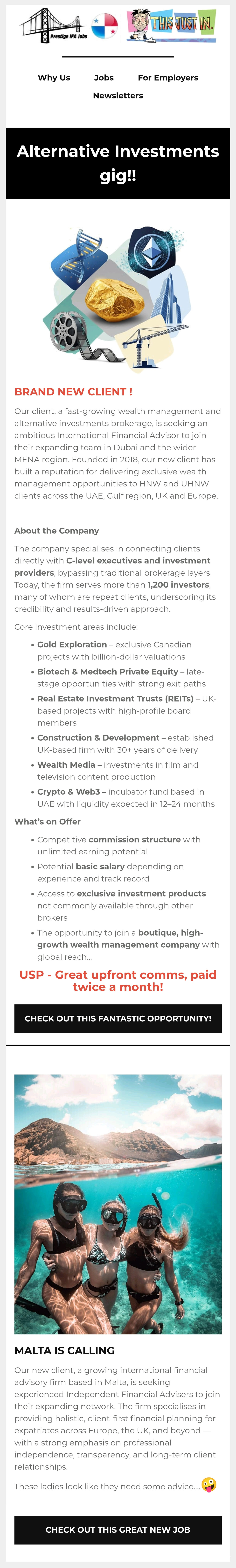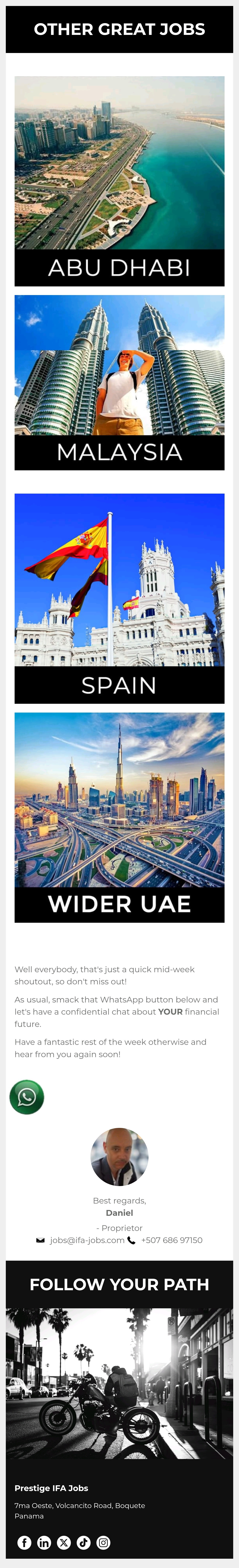 Hi everybody, Since email filters are increasingly restrictive and many important IFA Job emails from us end up landing in junkmail, I just thought to re-send a few previous messages over the next week or two. For those of you whom have seen this message below already, feel free to skip over and kindly bear with me as I’m just trying to find my feet here on SUBSTACK and see what works, and what not. Thank you again to each and everyone of you for your continued support over the last 7 years,...
